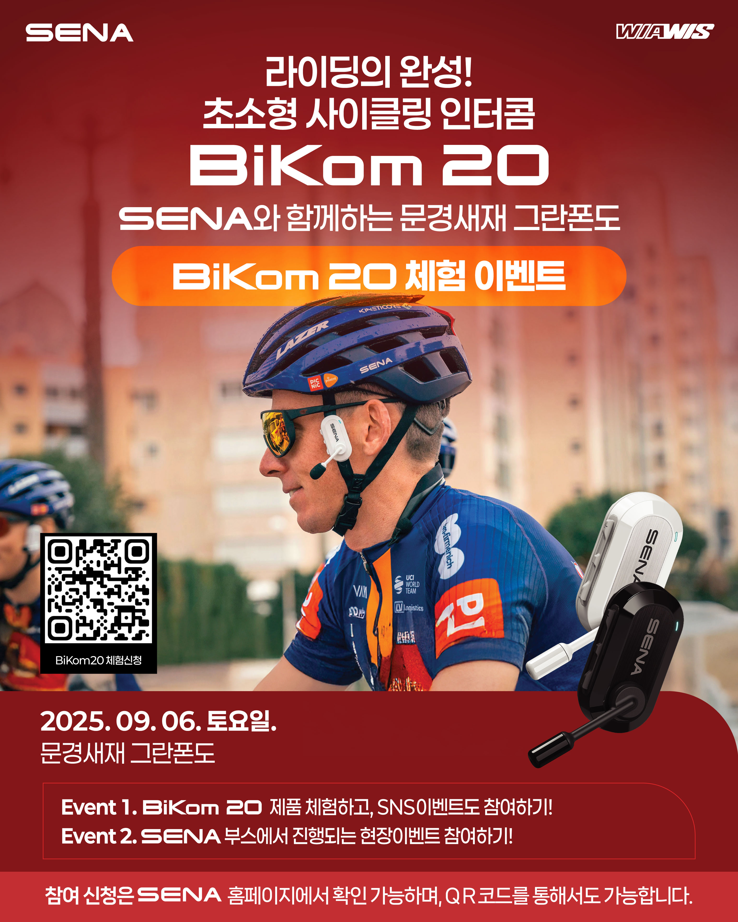 '2025 문경새재 그란폰도‘ SENA 사이클링 인터콤 [BiKom 20 무료 체험 이벤트] 접수 안내 🎉 ’2025 문경새재 그란폰도 (9/6)‘ 에 참여 예정이신 분들께 세나의 새로운 사이클링 인터콤 ’BiKom 20‘을 무료로 대여해 드리는 이벤트를 진행합니다. 본 이미지의 QR코드를 통해 접속해주시거나 URL 링크를 통해 신청서를 접수해주시면 검토 후 바이컴 20을 대회 전과 당일에 사용해보실 수 있도록 무료로 보내드리고 대여해 드릴 예정입니다. 사전에 BiKom 20 체험 신청을 하지 못하신 분들은 대회 당일에, 대회 행사장에 위치한 'SENA 부스'를 방문해 주시면 간단한 신청 절차를 통해 무료 체험을 위한 대여를 진행해 드릴 예정입니다. 🙂 최고의 퍼포먼스와 안전, 재미까지 함께하는 바이컴20! '투르 드 프랑스' 월드투어 사이클링팀의 사이클링 인터콤을 체험해 볼 수 있는 기회를 놓치지 마세요! 😁👍 ▶️ '바이컴20 체험 신청'은 2025 문경새재 그란폰도 참여를 확정하신 분들만 신청하실 수 있습니다. |